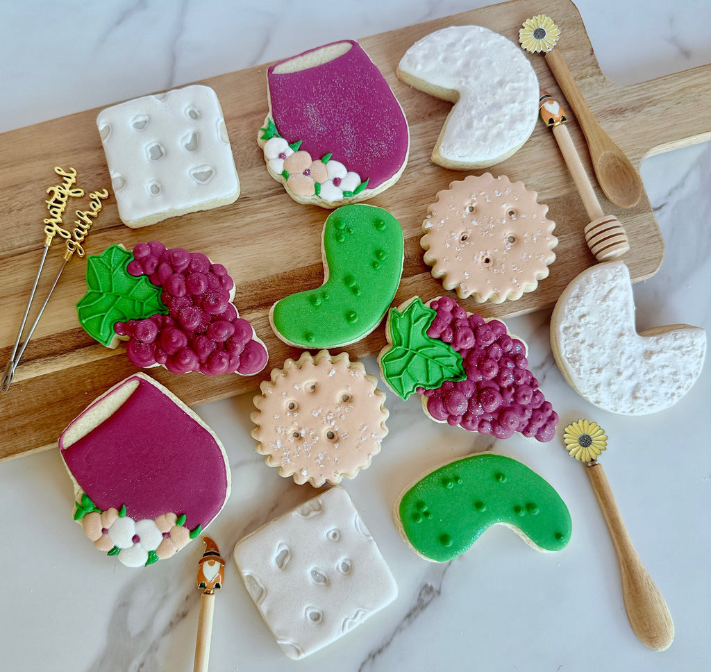 This adorable set features cookies inspired by your favorite charcuterie board goodies — think “cutie” versions of grapes, cheeses, wine glasses, crackers, and more! Perfect for gifting, snacking, or showing off at Friendsgiving.